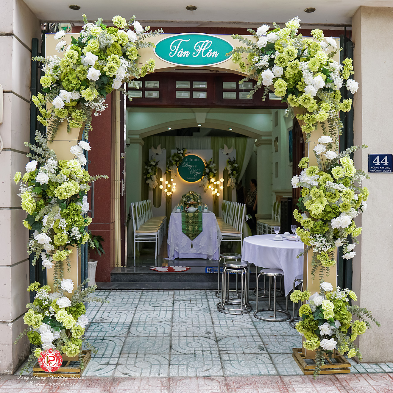 Cổng hoa lụa tông màu hồng khô vàng kem khung sắt vương miện vàng sang trọng làm khung sườn chính kết hợp với dây lá ,hoa hồng trắng, phi yến, hồng trà ....Dưới bàn tay điêu luyện của nghệ nhân cắm hoa đã tạo nên một không gian mộc mạc,ấn tượng hút hồn thượng khách ngay từ ánh nhìn đầu tiên .Với nguyên liệu hoa lá nhập khẩu màu sắc dựa trên bảng màu của hoa tươi nhờ vậy mà mỗi cổng hoa mang một phong cách riêng không trùng lặp với bất cứ sản phẩm nào khác trên thị trường
