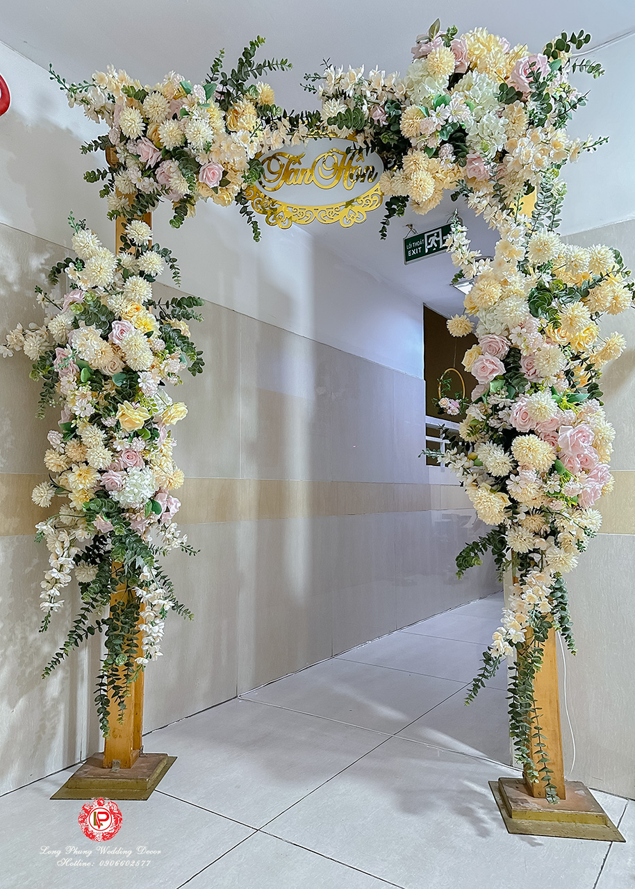 Cổng hoa lụa cưới hỏi size nhỏ cho căn hộ, chung cư, hẻm nhỏ tông màu vàng hồng kết hợp giữa hoa hồng ,hoa cát tường, lan hồ điệp trắng lá xanh với đủ size hoa khác nhau ,...Dưới bàn tay điêu luyện của nghệ nhân cắm hoa đã tạo nên một không gian mộc mạc, ấn tượng hút hồn thượng khách ngay từ ánh nhìn đầu tiên .Với nguyên liệu hoa lá nhập khẩu màu sắc dựa trên bảng màu của hoa tươi nhờ vậy mà mỗi cổng hoa mang một phong cách riêng không trùng lặp với bất cứ sản phẩm nào khác trên thị trường